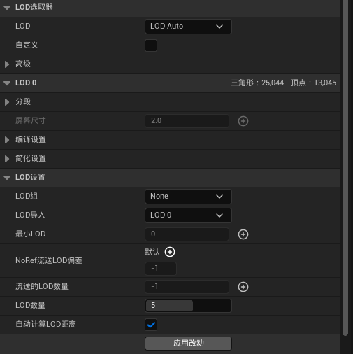 一般调整为5左右就差不多了,记得选中自动计算lod距离,随后点击应用改动,如果需要自定义lod层级,则勾选上方的自定义方框。