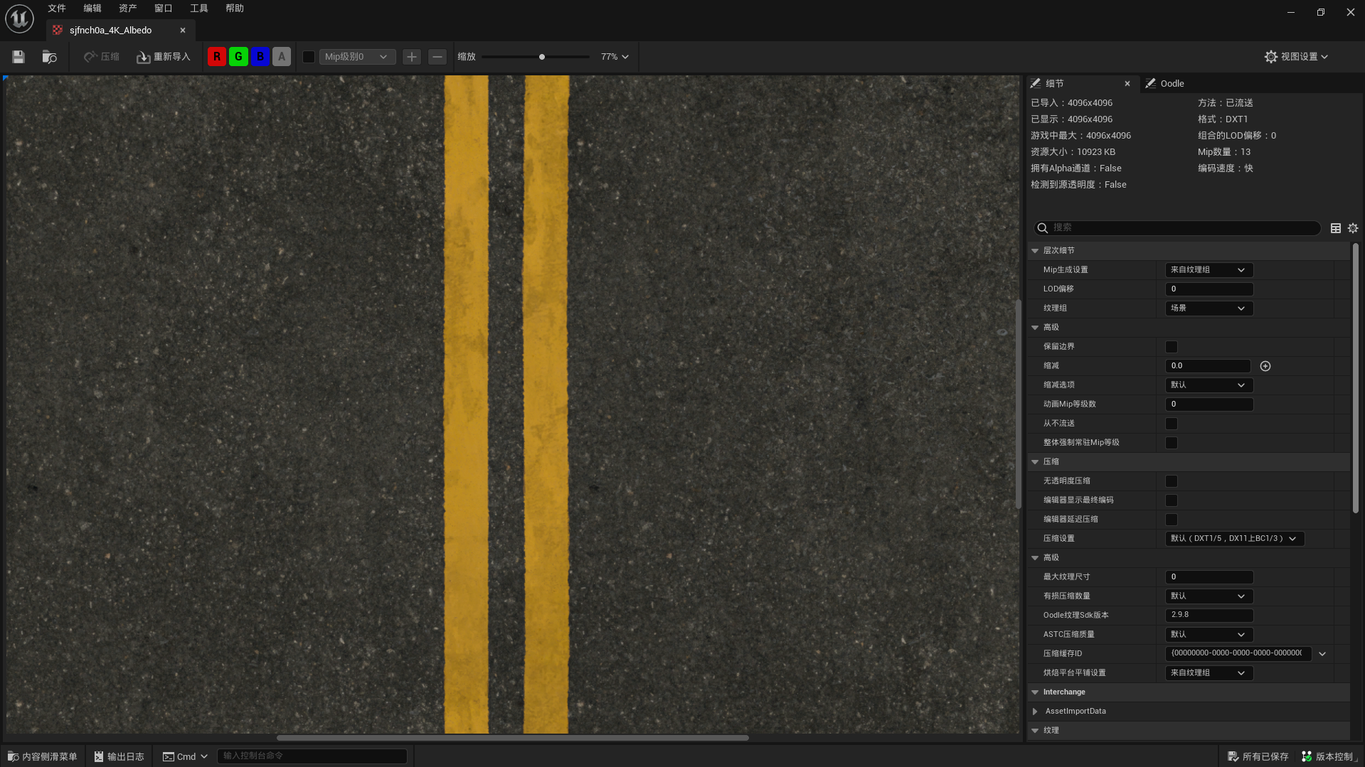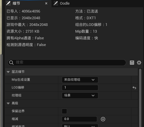 方法1:进入到一个纹理编辑页面,更改细节面板中的“lod偏移”参数,lod值增加1,则该材质的已显示分辨率会降低一倍,例如本例中的材质分辨率为4k,将lod更改为1后,分辨率降低为2k