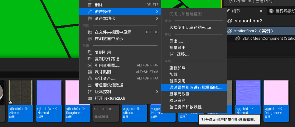 同时选中多个材质,右击,选择资产操作➡通过属性矩阵进行批量编辑,更改右侧的属性编辑器中的属性即可批量更改。