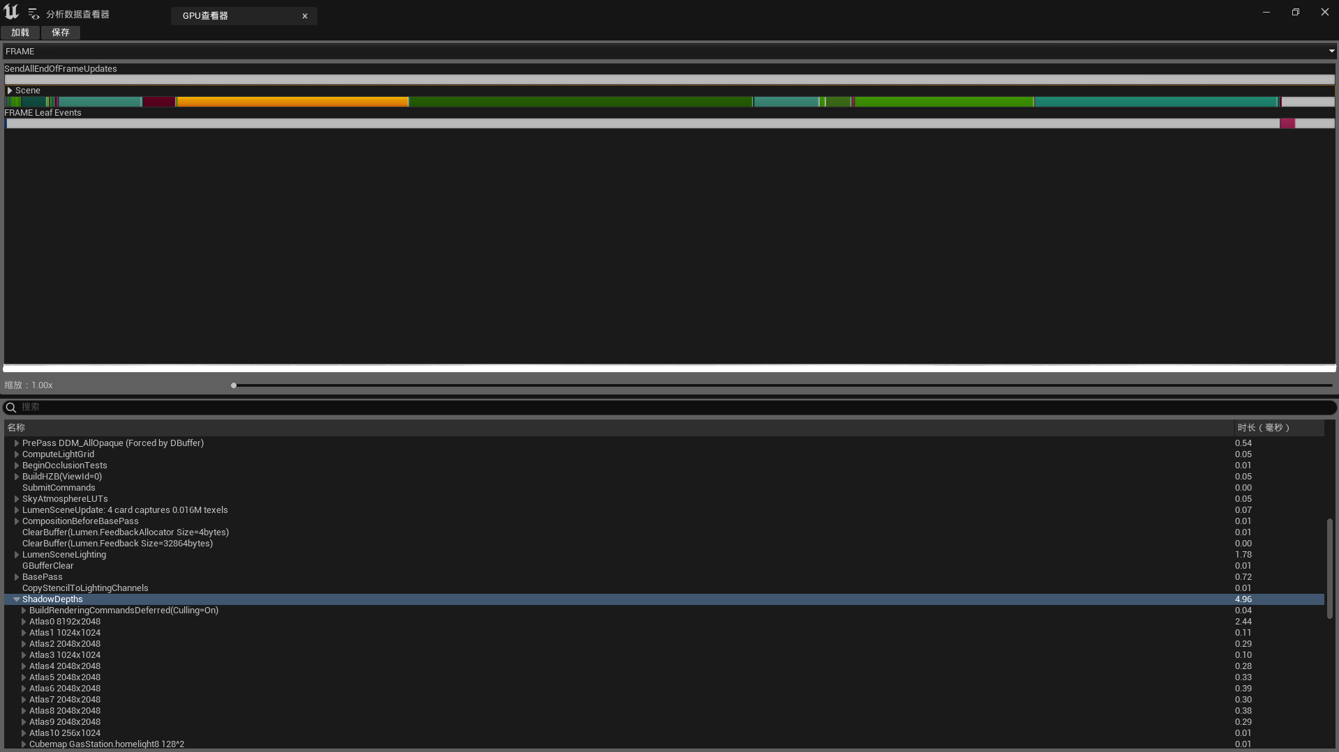 通过分析帧生成耗时,来判断花费较大的资源。例如此例中,shadow depths时长4.96ms,开销较大。