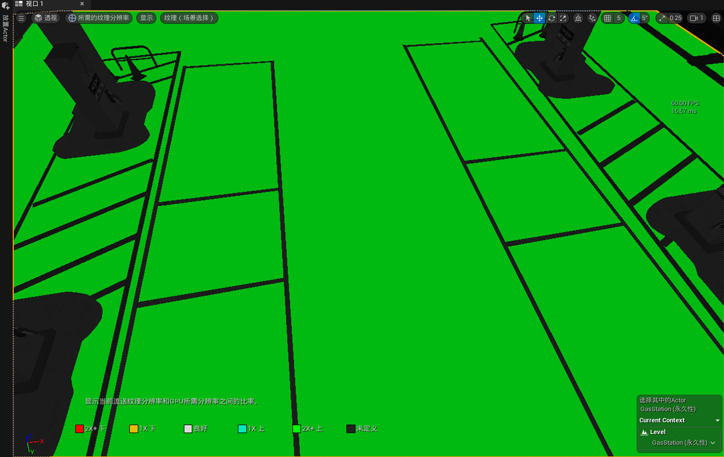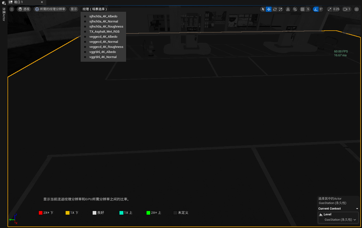 在所需纹理分辨率视图模式下,需要指定场景中的actor进行材质分辨率判断,例如此例中选择了地板actor,点击左上方的纹理(场景选择),选择该网格体的任意纹理查看,如果材质显示为绿色,则说明当前的材质分辨率较高,可以降低材质分辨率进行优化。