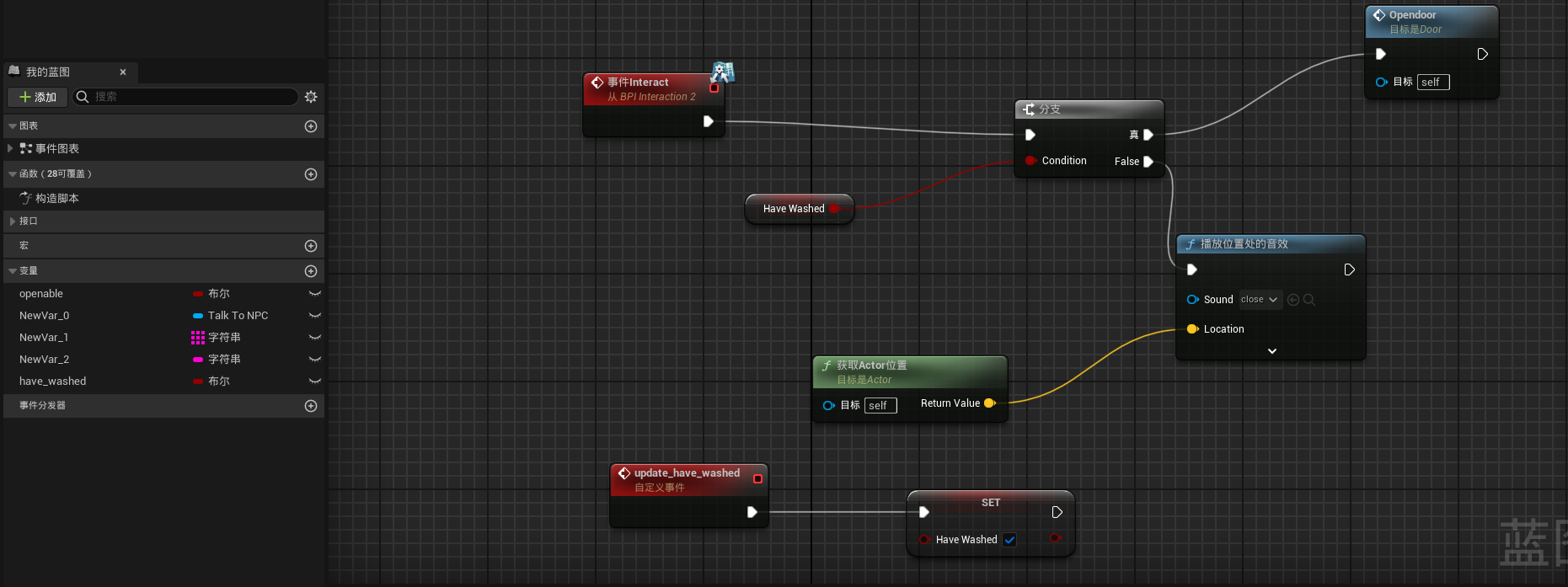 如上图所示,这是门的一个子类蓝图,在继承父类蓝图后重载父类方法后添加了门无法随意开关的逻辑。